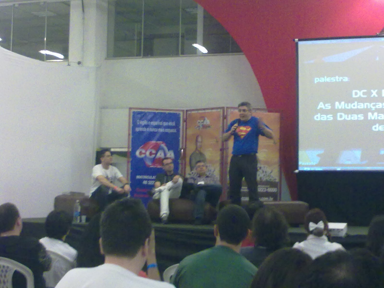 E ao final um grande debate sobre Marvel vs DC, ou ainda sobre qual das duas tem errado mais quando o assunto é respeitar o leitor e manter a coerência em suas séries mensais. Comparações com o mercado europeu, informações internas, análise do históricos e especulações sobre atitudes editoriais... tudo num papo solto com Mario Barroso (já estafado de ficar falando sem parar), Hector Lima (mantendo a neutralidade pra equilibrar os dois últimos), Fabio Fernandes (estourado e muito cômico; de acordo com ele mesmo, chorou em quase todo final de sega super-heróica e "morte" quando elas não vinham com validade pré-programada) e Sidney Gusman (editor que já trabalhou com mangás da Conrad, atualmente está na MSP e foi defensor vigoroso da DC, mas sabendo notar as falhas da mesma com imparcialidade). É impressionante ver o amor que esses caras demonstraram ter pelas aventuras em quadrinhos e a experiência que tinham, tanto de terem "vivido" os momentos clássicos de várias séries quanto o conhecimento de terem ou estarem trabalhando nesse mercado. Fechou com chave de ouro o dia.